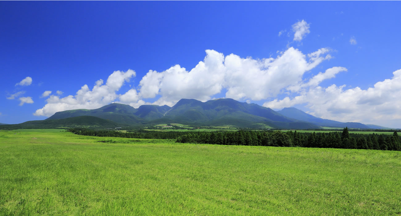 標高600 ~ 1,700m 級の山々に囲まれた日本有数の高原地。どこまでも続く草原の先に絶景が広がります。