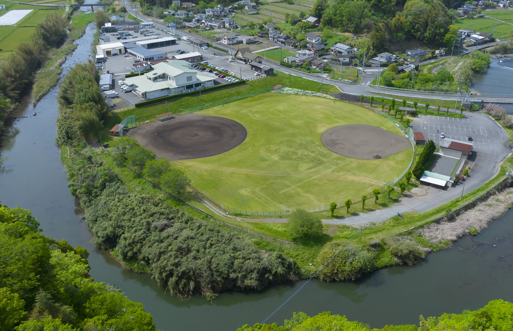 竹田市中心部にほど近い、緑豊かなや野球場。シンプルな設備ですが野球のほかにもソフトボールやグラウンドゴルフなど幅広く利用できます。